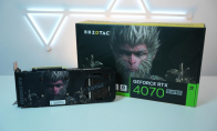 在各位天命人们忙着斩妖除魔的日子里,有不少硬件厂商也是推出了《黑神话:悟空》联名系列显卡,我们也是有幸收到了一张。在打完第一、二章的10个小时里,我感受到了《黑神话:悟空》顶级的美术画面,完全对得起玩家这么多年的等待。今天就让我们看看黑神话:悟空在这张RTX 4070 SUPER上会有什么样的表现。 外观:在显卡的外包装上,印着天命人闭眼凝神的照片,相信有不少天命人此时此刻的电脑桌面壁纸正是这张照片。背面则是一幅精美的壁画,内容为石猴石猴拜须菩提祖师为师的场景。 回到显卡本体,RTX 4070 SUPER悟空的风扇和外壳全都喷上了黑色的漆面,仔细一看还能发现外壳上应有毛笔书写的“悟空”二字。 显卡背面呼应包装盒,融入了黑神话:悟空的主角形象,闭眼凝神,一心斩妖魔,除孽障