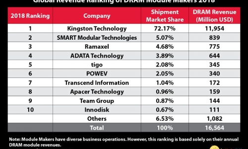 金士顿蝉联DRAM模块供应商排名榜榜首
