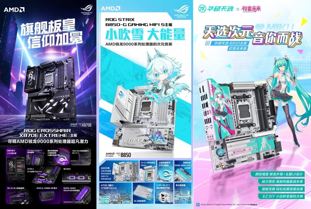 4月12日,2025 ROG DAY暨新品发布会,华硕电脑开放平台中国区总经理俞元麟(普普通通Tony大叔)化身实验室社长,和wawa一起带领虚拟实验室社员及现场共创者,为大家带来了华硕与初音未来梦幻联动的电竞全家桶。其中,作为电脑的核心——华硕天选B850主板初音未来版也在发布当天的12点正式预约,售价1449元。预约链接:https://item.jd.com/100206282240.html 华硕天选B850主板初音未来版以“初音未来”和“天选姬”为灵感打造,从硬件到软件全方位深度定制,带来全感官次元体验!整体装甲采用月光白搭配初音未来代表色苍绿色,加上浅色PCB设计,可谓是天选颜值。特别是IO装甲闪卡设计,巧妙通过光栅工艺,让MIKU和天选姬的身影随光变幻,双厨狂喜,带来双倍心跳!同时,融入