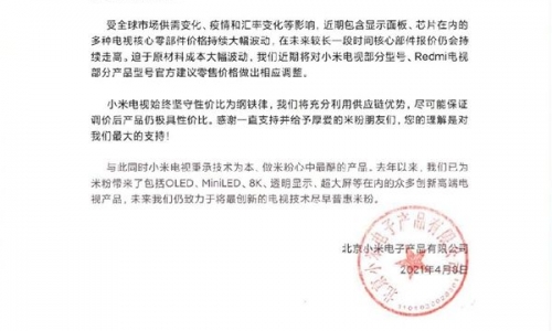 近期以来,“涨价”成为半导体行业关键词。国内外IC厂先后发布涨价函,原因也基本一致。随着供应链情况日益紧张、晶圆及封装资源紧缺且费用大幅上涨、投产周期延长等因素影响,导致成本大幅上升。  元器件涨价必然会向下倒逼消费电子商品涨价。今日,小米官方发布《关于调整小米电视及Redmi电视部分产品型号官方建议零售价格的说明》,正式宣布涨价。  小米称,受全球市场供需变化、疫情和汇率变化等影响,近期包括显示面板、芯片在内的多种电视核心零部件价格持续大幅波动,在未来较长一段时间核心部件报价仍为持续走高。  迫于原材料成本大幅波动,近期将对小米电视部分型号、Redmi电池部分产品型号官方建议零售价格做出相应调整。  小米强调,小米电视始终坚守性价比为纲铁律,将充分利用供应链优势,尽可能保证调价后产品仍极具性价比。  小米