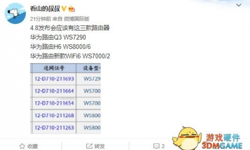 华为已官宣全屋智能及智慧屏新品发布会将于 4 月 8 日举行,数码博主 @看山的叔叔 透露,华为届时将推出三款新品路由器,至少包括:华为路由 Q3 WS7290、华为路由 H6 WS8000/6、华为路由新款 WiFi6 WS7000/2。华为路由 H6 此前已曝光:主路由搭载华为路由 AX3 Pro 同款的凌霄 Hi5651T 四核芯片,子路由均采用 AX3 同款的凌霄双核 Hi5651L 双核芯片。据介绍,一套华为路由 H6 包含母路由一个、子路由增强版一个、子路由两个。主路由 19.3 cm×8cm×2.8cm 很薄,重量 289g,子路由是 8.6cm×8.6cm×3cm,167g,预计价格不低。上述路由器均已通过工信部和 3C 认证,其中 WS8000 系列配备了 52.5V、1.75A 的电源适配器
