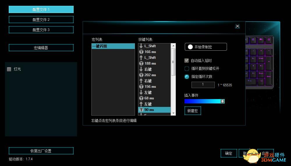 步骤一:打开驱动,选中雷柏V700RGB合金版的宏编辑,点击“宏编辑器”,再点击右下角的“新建宏”,命名为“一键闪技”。、