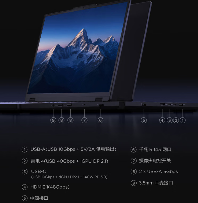 在续航与配置上,该机配备90Wh大容量电池,支持100W PD快充,经PCMark 10测试办公续航可达12小时,外出办公无需频繁插电;硬件配置上搭载16GB DDR5内存+1TB PCIe 4.0 SSD,且支持内存与硬盘扩容,多开游戏、存储大型游戏安装包都无压力,接口配置也十分齐全,满足外设连接、投屏拓展等需求。2.25kg的轻量化机身,更适合出差携带与日常通勤使用。