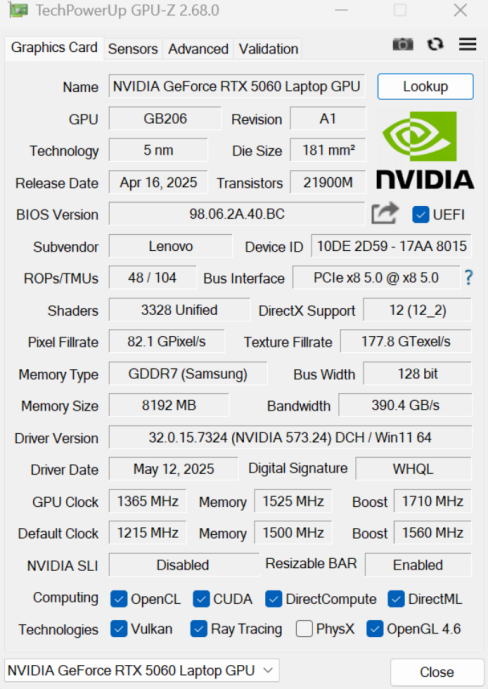 在游戏性能上,酷睿Ultra 7 255HX处理器的性能被充分挖掘,超能模式下CPU单烤稳定130W+,双烤总功耗达到195-205W,经CPU-Z测试多线程得分15131.2分,算力表现远超同价位机型。搭配115W满功耗RTX5060显卡,3A游戏性能较上代提升14%-24%,在2K低画质下运行《CS2》,平均帧率维持在480fps以上,电竞体验拉满。同时,处理器自带的独立NPU还能支撑端侧AI应用,通过LM Studio部署Qwen-7B模型时,对话中token的生成速度能达到每秒60个以上,AI办公体验流畅,让游戏本兼具生产力。