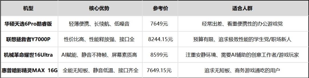 作为便携党首选的游戏本,华硕天选6 Pro酷睿版做到2.25kg轻量化机身的同时,还兼顾了游戏性能与静音体验,是出差党办公游戏双场景使用的高性价比之选。