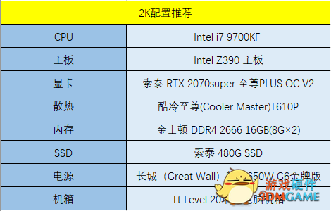 在2K情况下,对于配置就有一定的要求了,推荐使用 9700KF+RTX 2070super 的搭配。