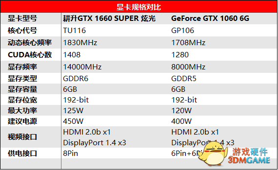 从表格来看,耕升GTX 1660 SUPER炫光OC与NVIDIA GeForce GTX 1060相比,CUDA核心数增加至1408,不过最主要的区别在于显存类型、显存频率和动态核心频率,动态核心频率提升为1800MHz,显存频率从8000MHz提升到14000MHz,显存类型升级为GDDR6。