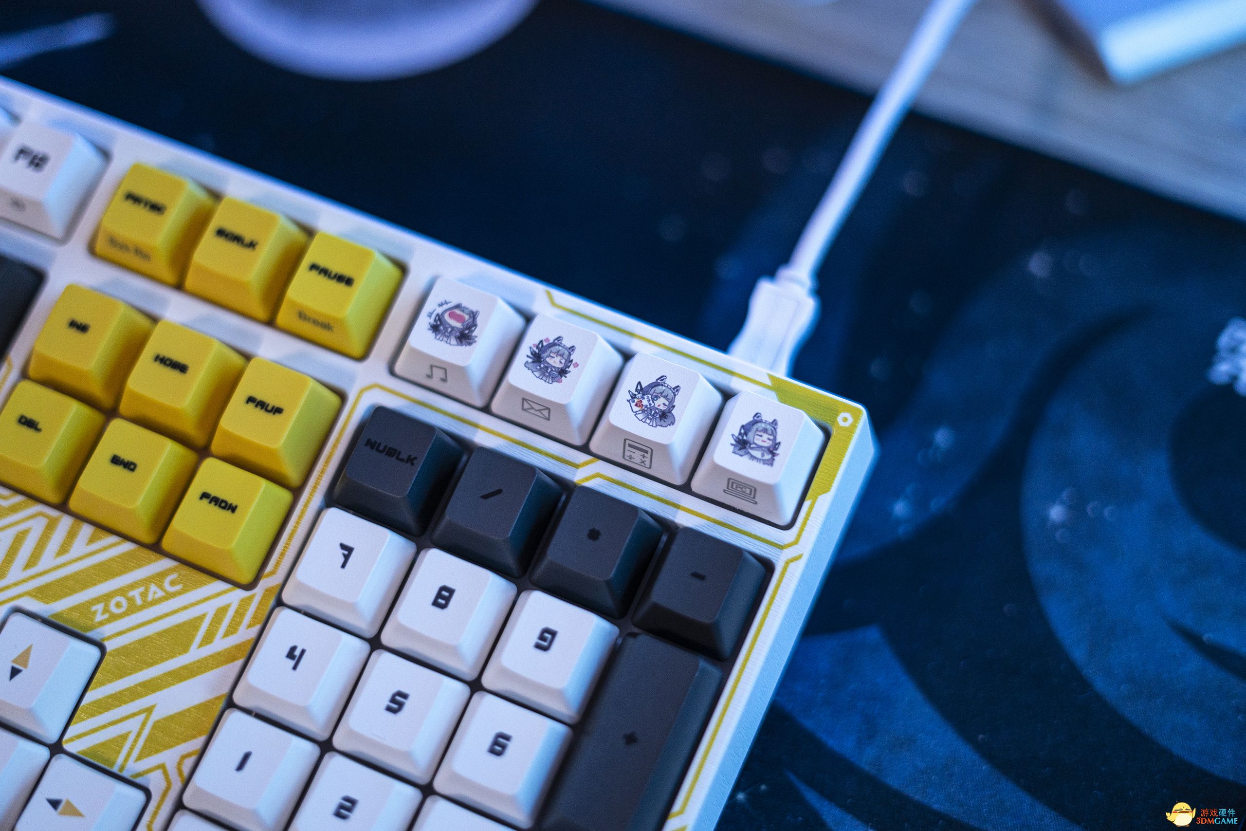 “天启姬”主题限定键盘,以索泰“天启姬”形象为核心元素精心雕琢打造而成。简洁淡雅的黄、白灰配色,搭配赛博朋克风格的线条纹路点缀,突显轻奢科技美感