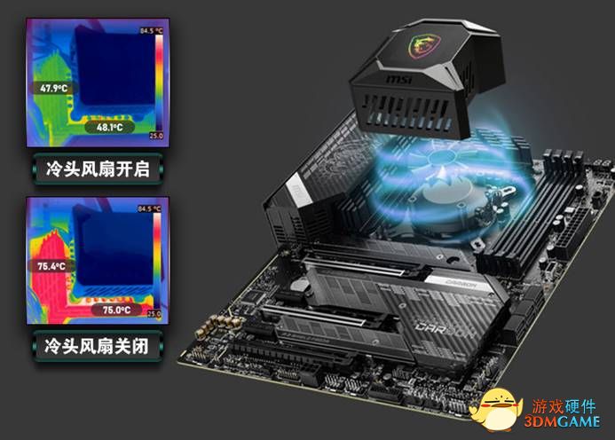 此外,MPG CORELIQUID K360的水泵还采用了一个别出心裁的设计,即在冷头中内置了一个60mm的 TORX 3.0风扇,这样在机器运行时便可以做到同时为CPU周围的主板供电模组散热,进一步降低VRM温度,一举多得,实属妙哉。