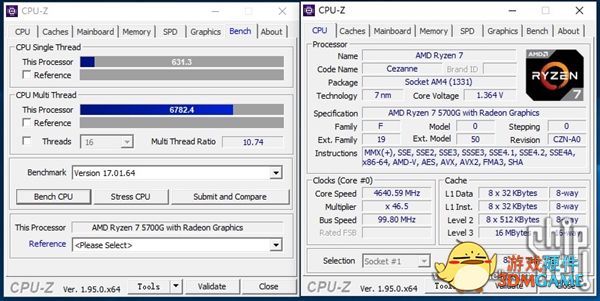 CPU-Z测试跑分单核心631、多核心6782,比之前的样品分别高了大约3%、7%。