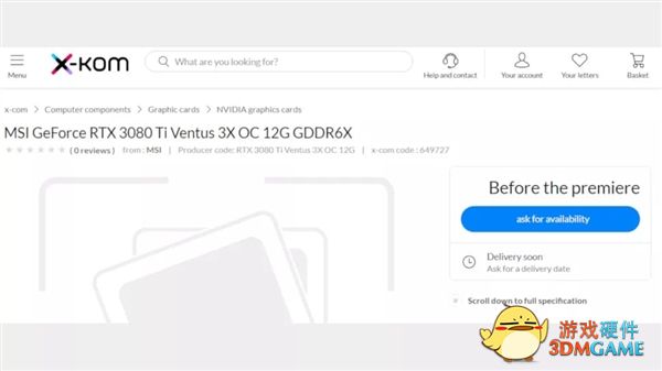 RTX 3080 Ti可能是传言时间最长的显卡了,日前在波兰电商X-Kom的网站上,来自微星的RTX 3080 Ti Ventus 3X OC已经悄然上架,店家提示,即将发货。