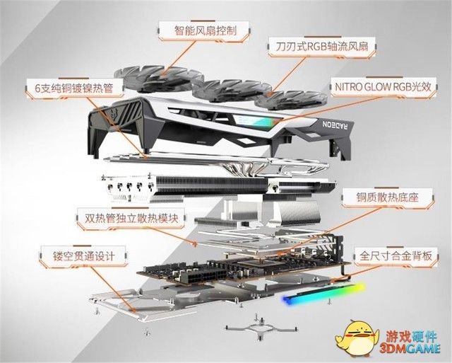 蓝宝石RX 6900 XT 超白金极光特别版采用三个双滚珠轴承风扇,可提供强劲风压且降低噪音,并有智能风扇控制技术加持。六镀镍热管有序贯穿在加厚锯齿形鳍片散热器中,全面覆盖显卡PCB板,有效强化散热效能,同时还有独立的显存/供电散热模组,快速释放显存、MOSFET、供电IC和电感产生的热量,让显卡能够以超低温稳定运行。