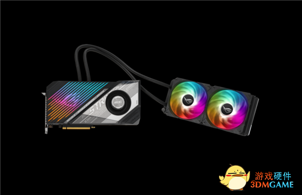其他方面,华硕这款新卡和原来保持一致,仍然是涡轮风扇风冷+一体式水冷混合散热,全覆盖铜底,240mm双风扇冷排,600mm水管,自带神光同步。