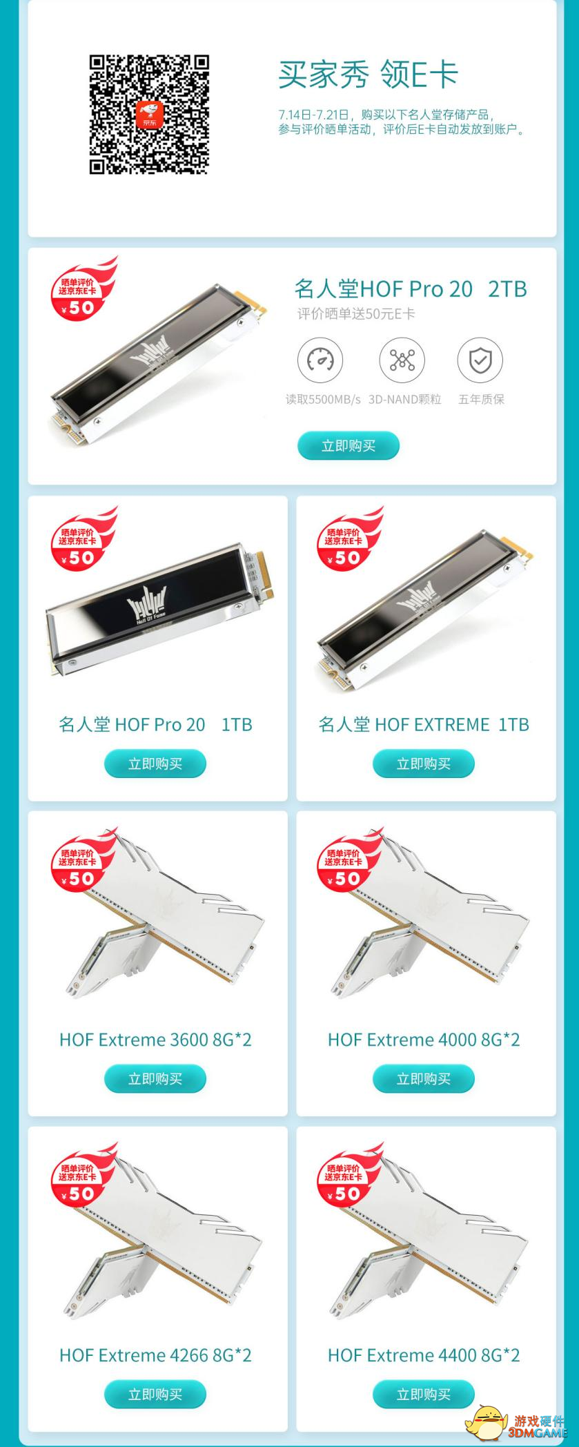 7月14日-21日,购买HOF PRO 20 M.2 1TB/2TB、HOF EXTREME M.2 1TB、HOF EXTREME DDR4-3600/4000/4266/4400 8G*2内存,并参与评价晒单活动后,50元京东E卡将会自动发放到用户京东账户。