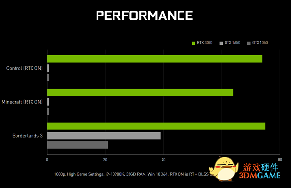 NVIDIA日前公布了RTX 3050显卡的一些性能数据,对比了《控制》《我的世界》及《无主之地3》这三款游戏的性能,其中《无主之地3》游戏,RTX 3050显卡的性能接近80fps,GTX 1650刚到40fps左右,GTX 1050刚到20fps左右,性能提升明显。