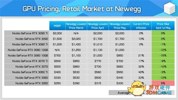 3060 Ti是最夸张的,平均贵了多达40%,另外3050 33%、3050 32%、3070 32%。