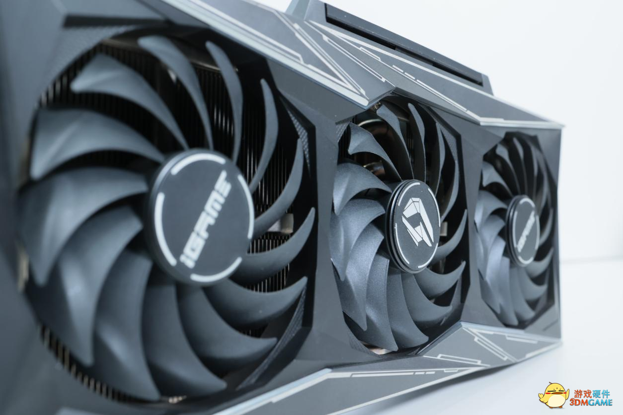 这款显卡在散热上也是下足了功夫,iGame GeForce RTX 3080 Ti Vulcan OC的风扇与上代的相比也有所不同,扇叶的数量有所提升,从9片增加至13片叶边缘折角的“捕风手”风扇搭配冷排特有的鳍片排列方式,可将气旋压入散热器内实现风压及进风量的进一步提升。另外一个细节就是,iGame GeForce RTX 3080 Ti Vulcan OC三个风扇中央的logo牌均采用双层处理,上面的一层可手动旋转角度,不会随着风扇启动而旋转。