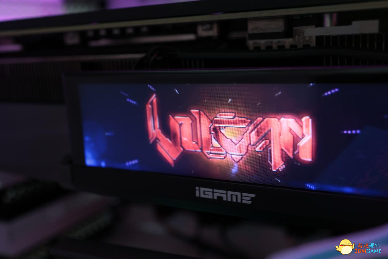 iGame GeForce RTX 3080 Ti Vulcan OC火神系列显卡的一大特色就是全新的LCD侧显示屏——“维”。另外这个LCD屏还可翻转90°,适合竖装显卡的用户,之前Vulcan显卡上的屏幕由于色彩不多,所以实用性也不是非常强。而在GeForce RTX 30系列的Vulcan火神显卡上,这个LCD屏幕就得到了不少提升。