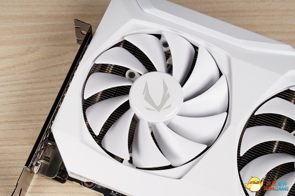 显卡顶部点缀有ZOTAC GAMING的LOGO信仰灯,为了与整卡的月白主题相呼应,LOGO灯效被设计成月光般的莹白,暗时为静谧的夜空黑,甫一点亮,如玉之莹,如月之晕,平添几分淡雅美感。