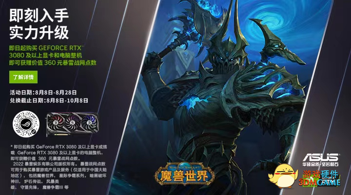 hello,小伙伴们!暴雪送点卡活动又来啦~2022年8月8日至2022年8月28日,NVIDIA将携手华硕启动购买“华硕显卡或搭载华硕显卡的整机,即可获赠价值360元人民币的暴雪游戏点数“的活动!先到先得,速速来参与吧~