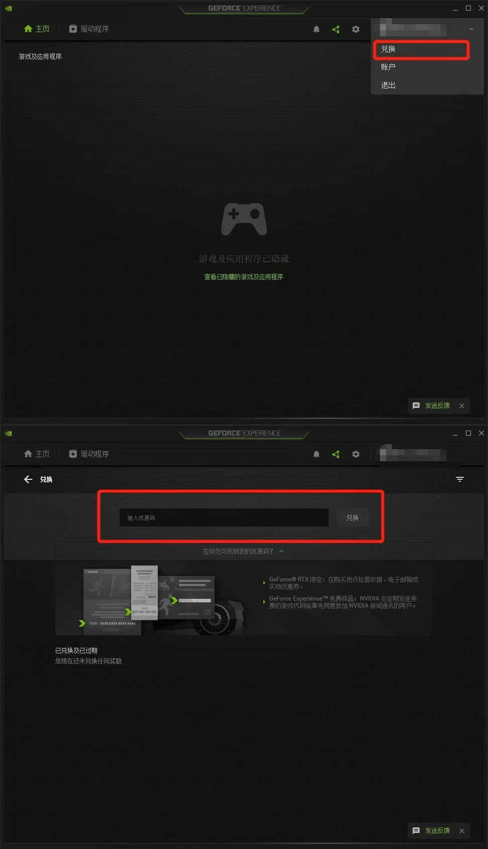 4、 登录NVIDIA GeForce Experience软件,点击右上角头像,点击“兑换”按钮输入礼包兑换码,即可获得穿越火线的礼包~