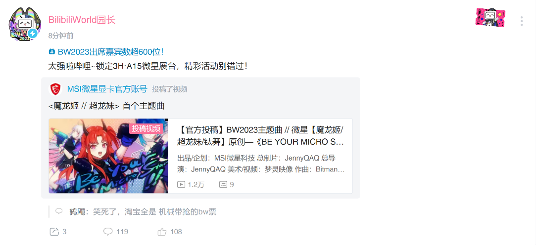 《BE YOUR MICRO STAR》首度在B站【MSI微星显卡官方账号】上发布,吸引了众多用户的观看,深受玩家的喜爱,更是收到了BW组委会BilibiliWorld园长的关注和分享。
