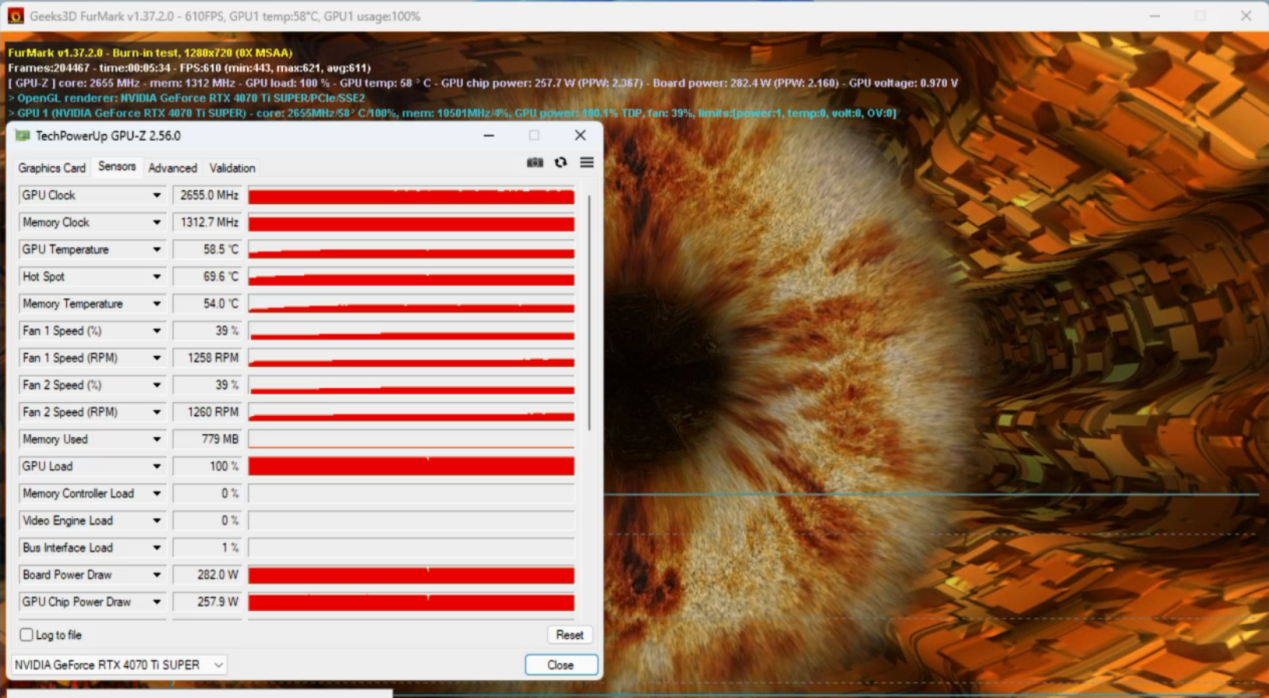 从FurMark考机情况来看,ROG STIRX RTX 4070 Ti SUPER在满载考机时的最高频率也能达到2655MHz,此时显卡的整板功率达到了282W,GPU最高功率达到了257W,在此状态下,凭借着性能强悍的散热器,ROG Strix RTX 4070 Ti SUPER的GPU最高温度只有58.5℃,热点温度也不过69.6℃,风扇转速不过39%,几乎听不见明显的噪音,散热表现十分优秀!