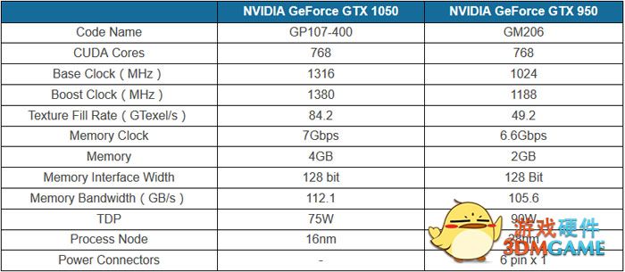 实际上GTX 1050的规格和GTX 950计划是一样的,当然了他们的核心架构完全不同,GTX 1050的频率也比GTX 950高不少,它的核心基础频率是1316MHz,Boost频率1380MHz,不过这个频率在Pascal家族中算是非常低的了,拥有4GB GDDR5显存,显存频率1750MHz,GP107是采用16nm工艺打造的,TDP只有75W,无需外接供电。