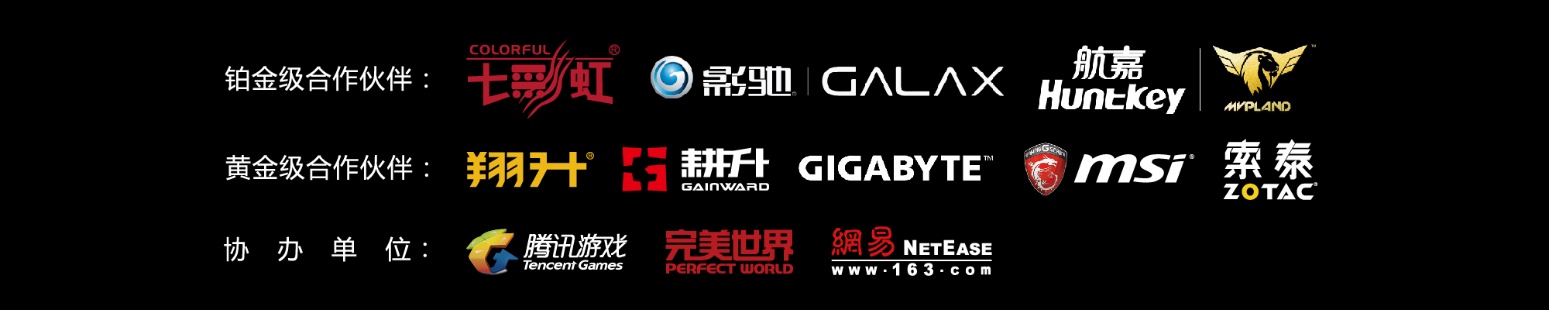 铂金级合作伙伴(排名不分先后):七彩虹、影驰、航嘉以及黄金级合作伙伴(排名不分先后):翔升、耕升、技嘉、微星、索泰,作为大赛指定的显卡和机电品牌为京东游戏Game+ 中国电子竞技娱乐大赛提供了全程的赛事支持,让本次赛事得到更优质的设备及资源支持。