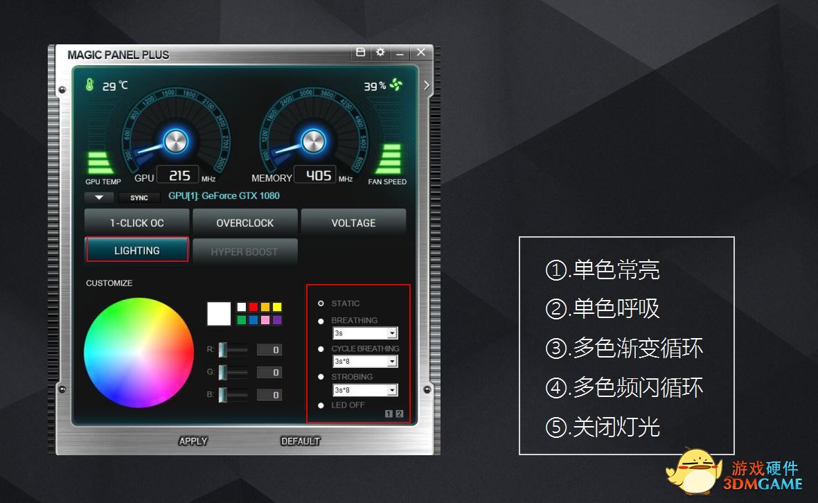 可编程RGB灯光功能是本次魔盘更新的最大亮点,选择Lighting按钮,参数调节区左侧为色板、中部为RGB参数、右侧为灯光模式选择。灯光模式自上而下分别为单色常亮、单色呼吸、多色渐变循环、多色频闪循环和关闭灯光,满足了大部分玩家对显卡灯光定制的需求。