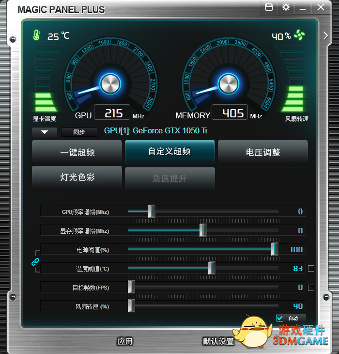 近日,影驰魔盘(Magic Panel Plus)发布了新版本,不仅添加了对GTX 1050和GTX 1050 Ti的支持,还将菜单改成了中文版。玩家可以更加直观的操作软件,对显卡超频和灯光效果进行调节。想要玩灯的小伙伴不妨下载来试试,下载地址:http://www.szgalaxy.com/__ZH_GB__/Driver5/MagicPlus