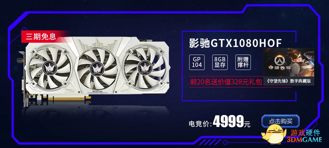 影驰GTX 1080 HOF显卡,纯白设计、附赠信仰支撑杆、8G显卡轻松应对4K游戏。原价5288元,活动期间仅售4999元,可享受三期免息。前20名下单玩家还送价值328元的《守望先锋》数字典藏版,游戏、装备一步到位,等的就是你!