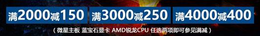 活动内容:在京东商城活动页面购买选购蓝宝石显卡、微星主板和AMD锐龙CPU任选两项就可以参加满减,满2000减150;满3000减250;满4000减400。