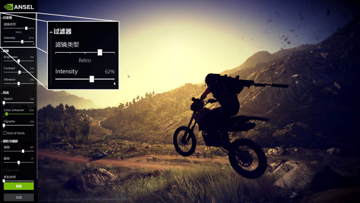 点开左侧Ansel工具栏第一项“过滤器”选项,可以看到Ansel预置的几款滤镜,包括黑白、复古等等。玩家可以通过滚动条按百分比调节滤镜的强度。