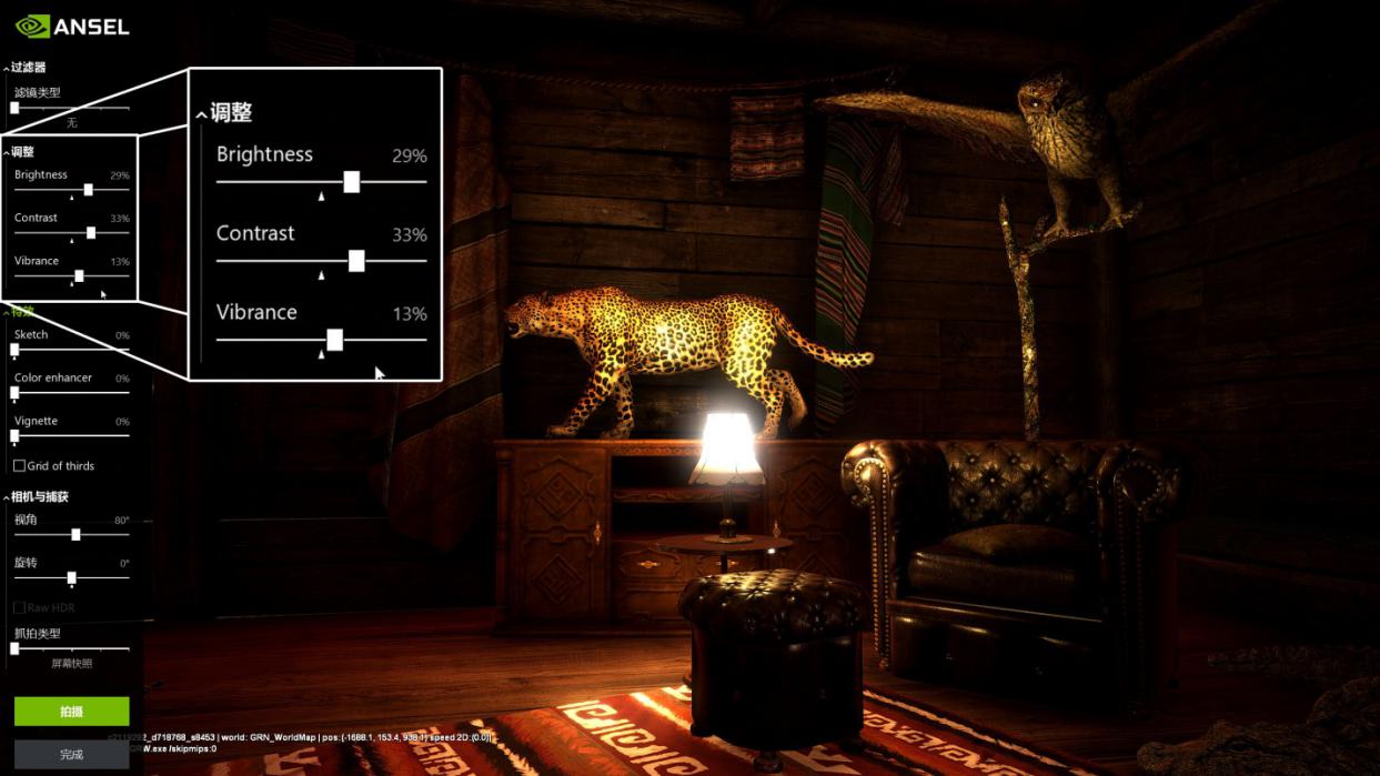 在左侧Ansel工具栏第二大选项“调整”中,玩家可以针对截图的基本参数进行调整,包括亮度(Brightness)、对比度(Contrast)以及自然饱和度(Vibrance)。