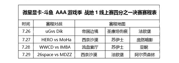 微星显卡-斗鱼 AAA游戏季战地1线上赛的四分之一决赛,赛制依然沿用单淘赛制度,采取三局两胜制,每场比赛抽取三张赛事地图,获得两张地图的胜利便取得本场比赛的胜利。