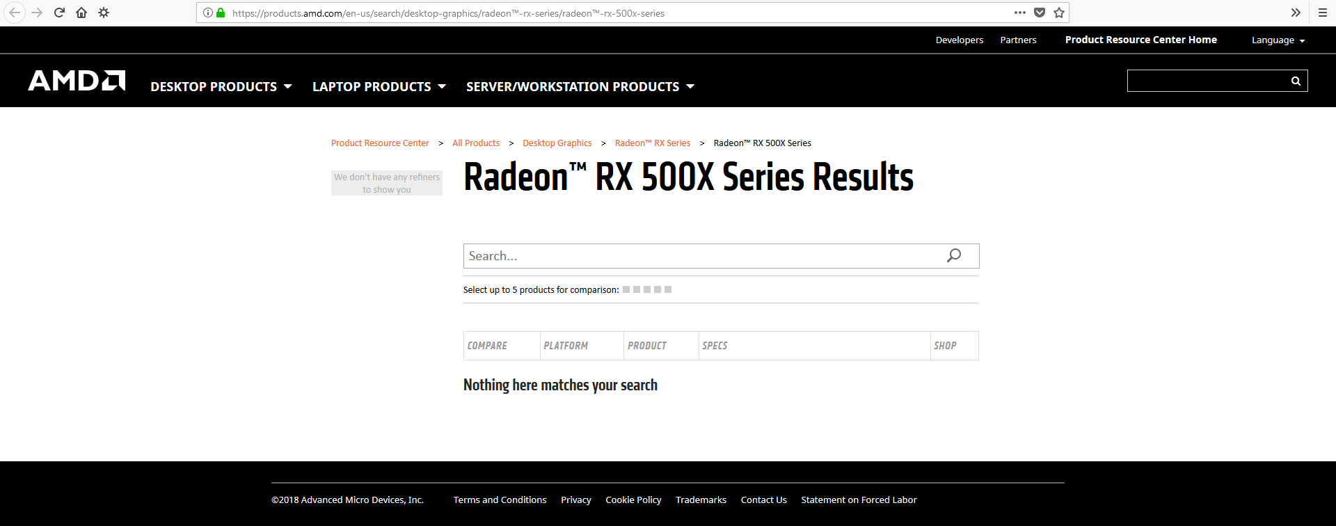 在今年年初AMD给出的RTG产品2018年规划中,桌面显卡仅有RX VEGA56/64两款,而且已经完全发布上市,不过最近有外媒在AMD官方网站上发现了RX 500X系列已经被公布了出来,尽管AMD官方对此一直保持沉默,并没有声明是页面错误还是员工不小心泄露出了更新计划,但根据AMD产业链相关人员的可靠消息表示,今年AMD的新品可能只有AMD Radeon 500X系列显卡。