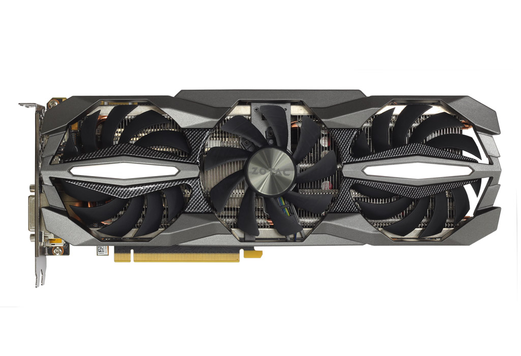 索泰GeForce GTX 1070Ti-8GD5 至尊PLUS,属于索泰仅次于PGF系列的次旗舰级至尊系列显卡。其外观设计正面采用4风扇全方位立体散热设计,外观更显修长,整体流线感极强。其深灰色的磨砂喷漆,搭配亮银色的金属点缀,以及碳纤维外观,显得时尚大气。配合正面3个大尺寸风扇工作的是一个强悍的散热模组,五根高速导热热管迅速将热量传递到大面积散热鳍片上。热管下面是一个由纯铜打造的底座,表面经过抛光处理,能够让其表面更平整,导热效率更高。