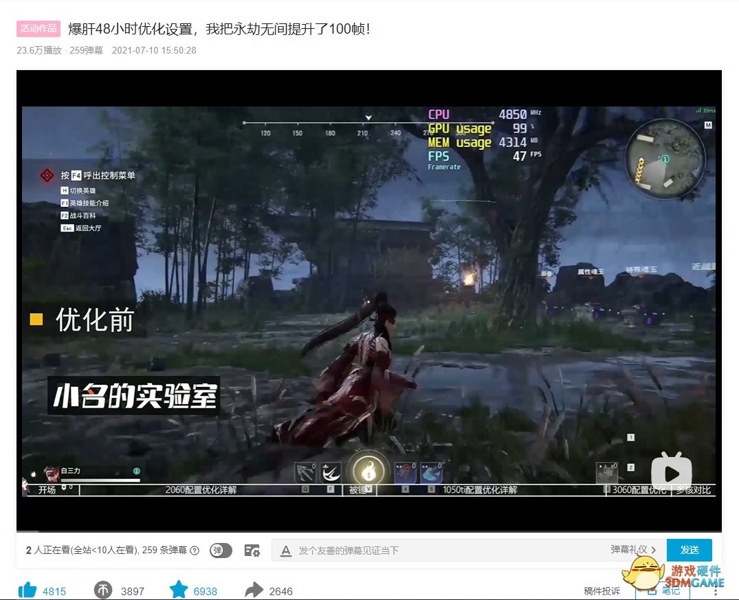 如旗下由小名的实验室面向站外在B站倾力推出的【永劫无间】优化视频——“爆肝48小时优化设置,我把永劫无间提升了100帧”,不但在站外收到了一众玩家的高度认可和肯定,同时也在官方社群和平台用户中掀起了剧烈反响和一致好评!