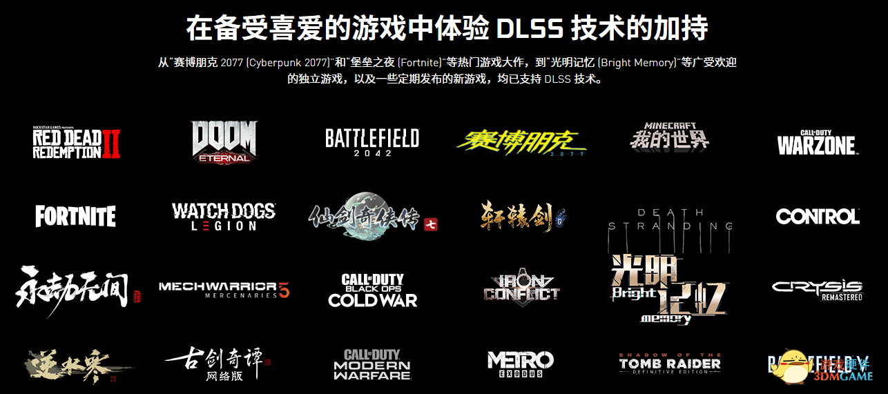 游戏方面,目前为止支持DLSS技术的游戏大概有10来款,比如:《战地5》《怪物猎人:世界》《仙剑奇侠传七》《古墓丽影:影》《飞向月球》《光明记忆》《控制》《赛博朋克2077》《永劫无间》《地铁离去》《逆水寒》……另外,目前NVIDIA DLSS技术已经更新到2.3版本并且已经植入到《仙剑奇侠传七》这款游戏中。随着越来越多的游戏开始支持NVIDIA DLSS技术,相信玩家们的游戏体验会越来越好的。