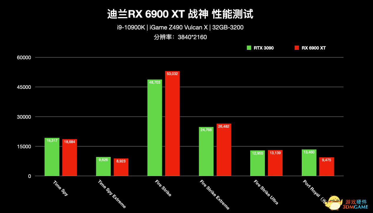 实测环节我们选择了6项跑分测试,以及10项游戏测试。测试均在3840*2160下进行。测试平台采用英特尔第十代酷睿i9-10900K搭配Z490主板以及3200MHz双通道16GB内存。