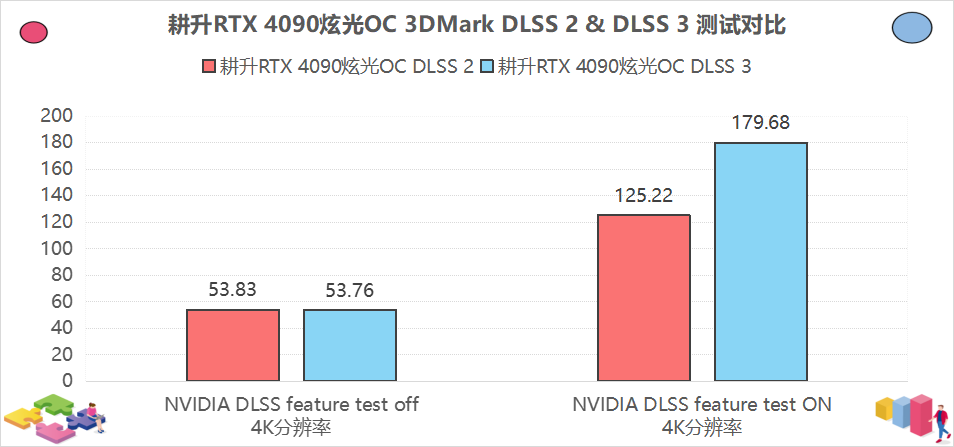 为了证实我们的说法,仍然通过3DMark的DLSS基准测试,对耕升RTX 4090进行了 DLSS 2和DLSS 3的测试对比。