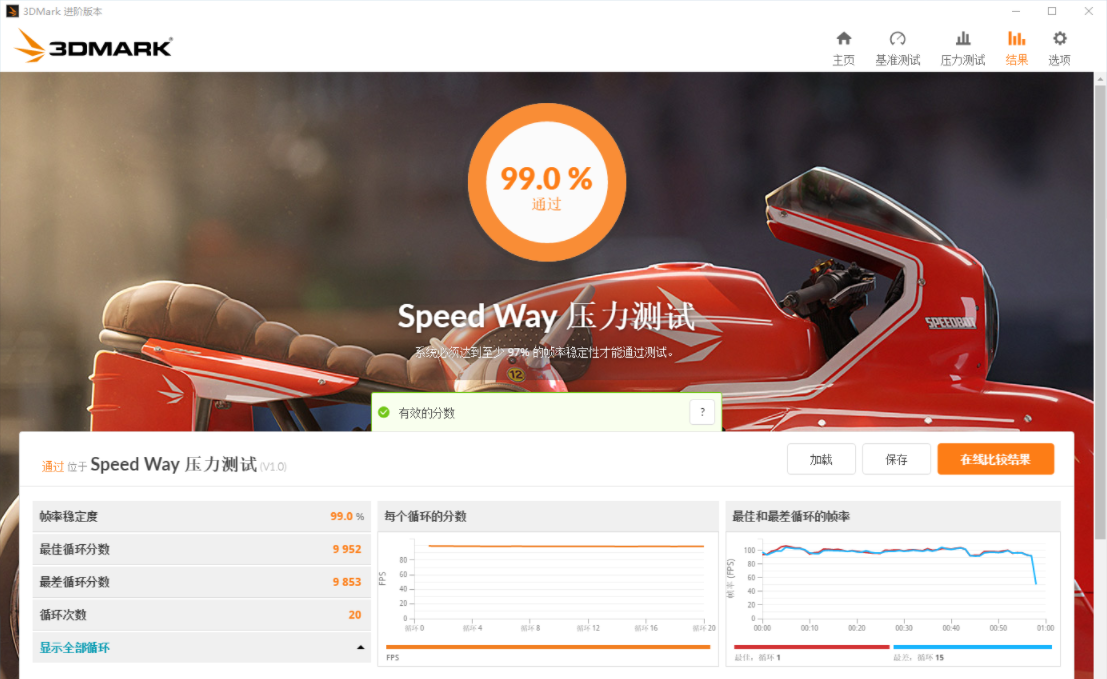最后是Speed Way测试,该测试使用了光追和实时全局照明来渲染逼真的照明和反射效果,并借助全新的DX12 Ultimate特性来优化行和视觉质量。该显卡也跑到了9970分,在目前的游戏中完美展现出光与阴的体验。