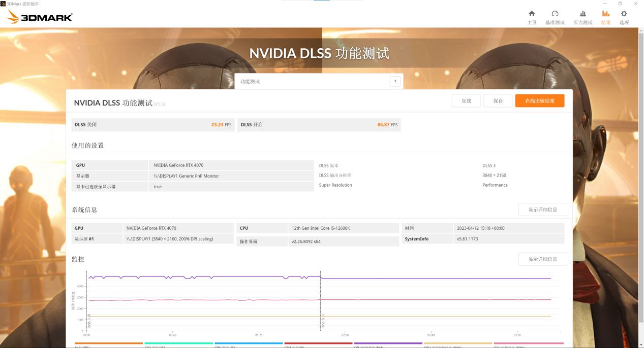 可以这么说,支持DLSS 3技术的RTX 4070与DLSS 2技术的RTX 3070 Ti相比较,原本已经处于弱势的RTX 3070 Ti已经更彻底被RTX 4070拉开了差距。我们同时也通过3DMark的DLSS测试对RTX 4070进行了一次跑分。