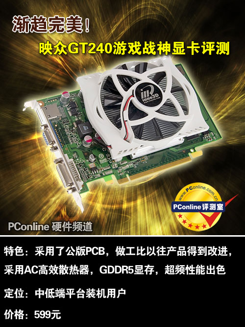Inno3D(映众)作为NVIDIA最重要的合作伙伴(AIC)之一,他们对产品性能及质量有很高要求,今天评测的 GT240游戏战神显卡就是一款改进版的GT240显卡,在上一款产品基于GT240游戏战神的基础上,发售了渐趋完美的新版Inno3D GT240游戏战神显卡,散热器采用了大厂AC生产的产品,且延续了公版PCB设计与GDDR5显存,加上599元的价格相比其他同价GT240有很大竞争力。