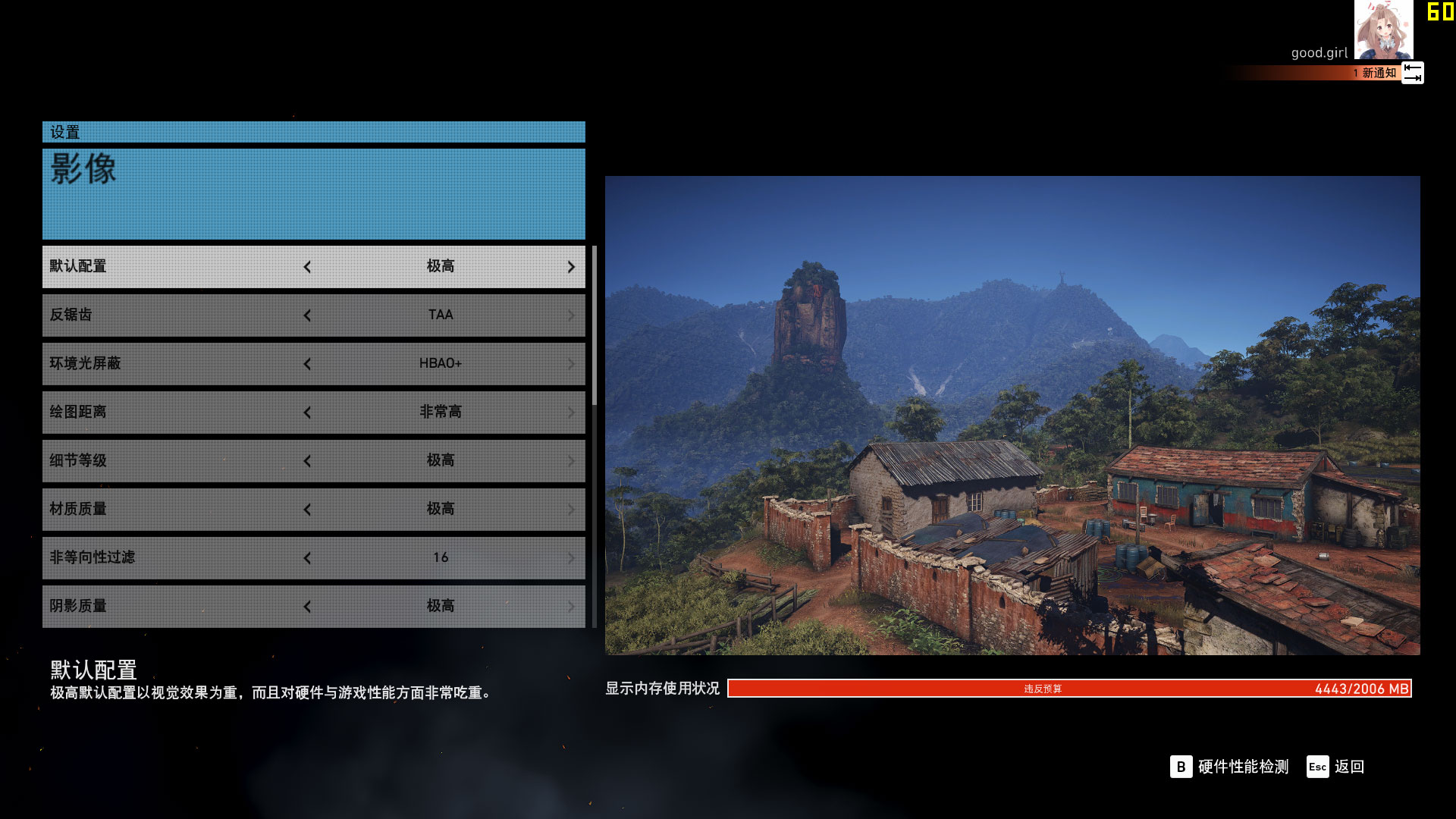 在画面设置部分,笔者使用默认极高画质测试,而针对入门级别显卡还会额外测试非常高画质。