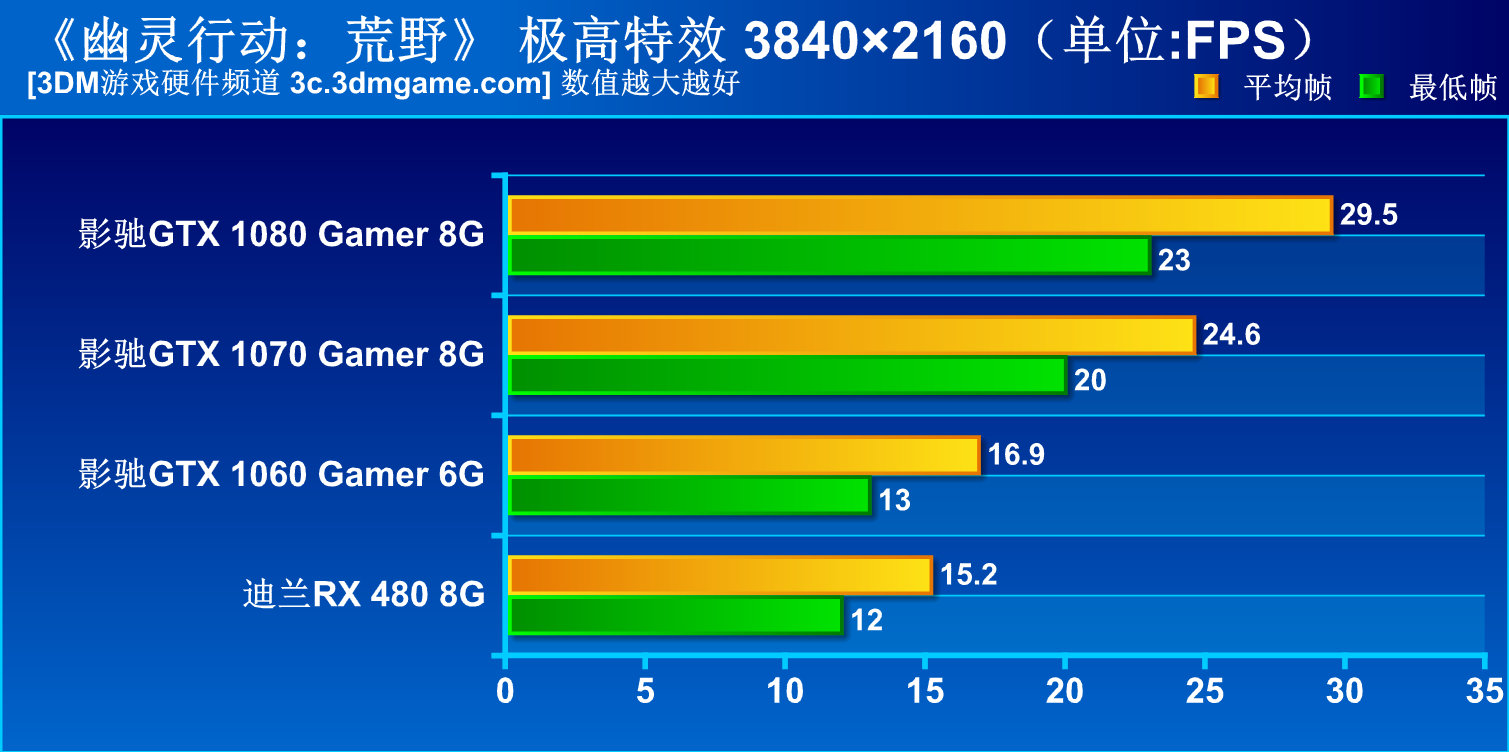 而在玩家中最为主流的GTX 1060和RX 480比较而言,GTX 1060以4帧的微弱优势领先,不过也仅仅达到了39帧,虽然不会感觉特别的卡顿,但在60刷新率主流,144刷新率大行其道的今天,玩家的眼睛早已被养的“娇贵”了起来,所以说如果想要在1080P全特效下运行,笔者还是推荐至少使用GTX 1070或以上级别显卡。