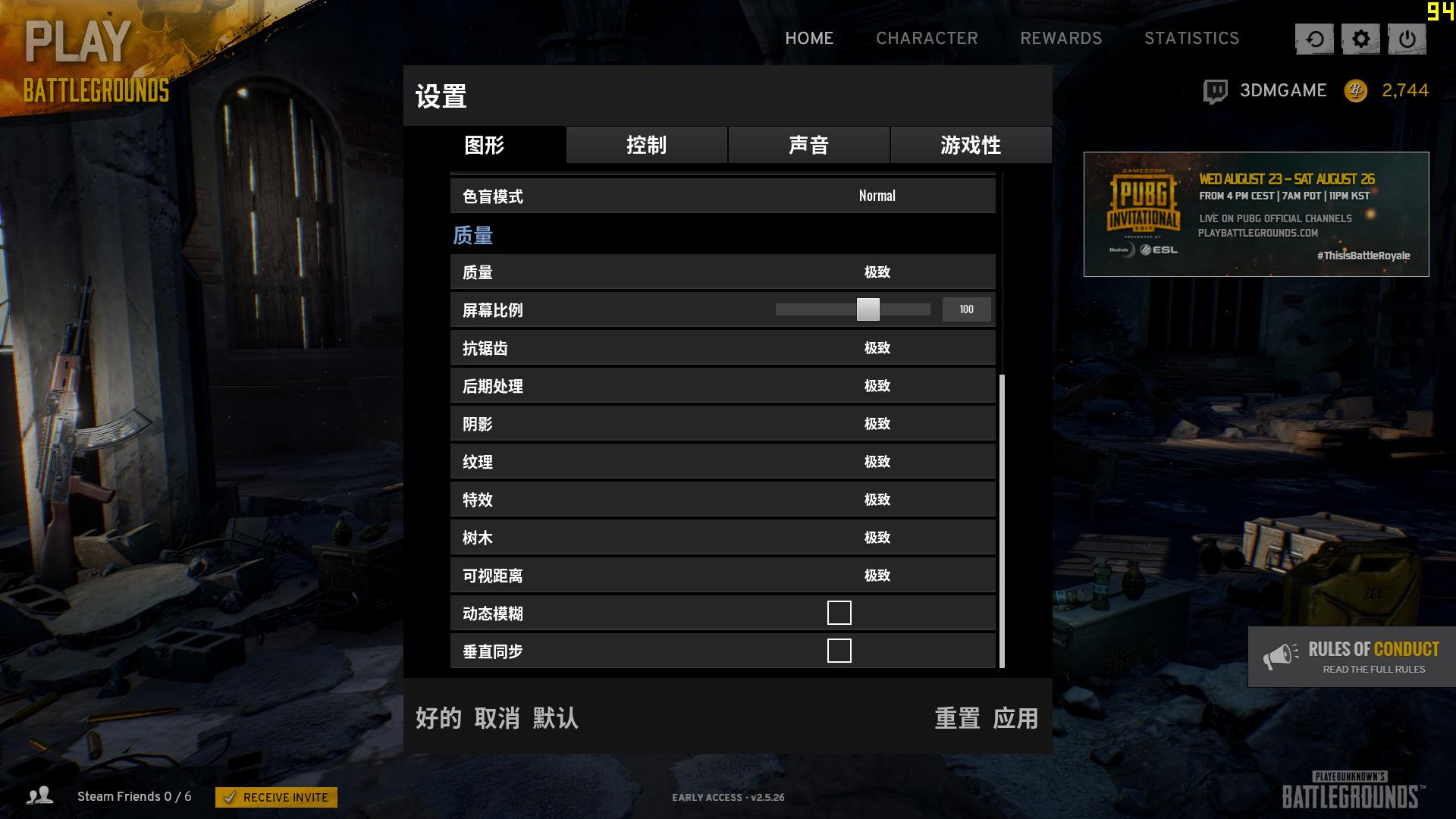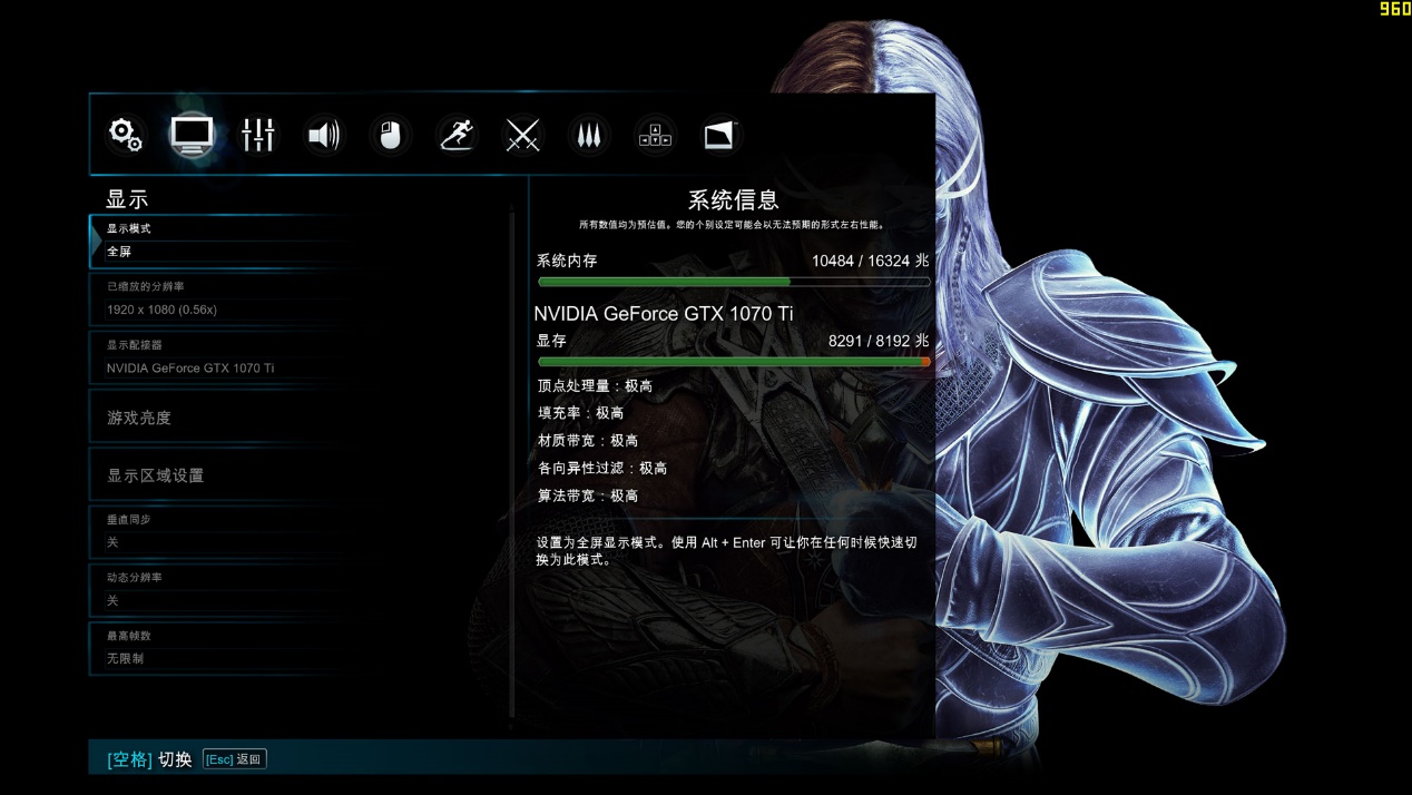 画质方面同之前一样,所有画面效果全部设为极致,并关闭垂直同步。