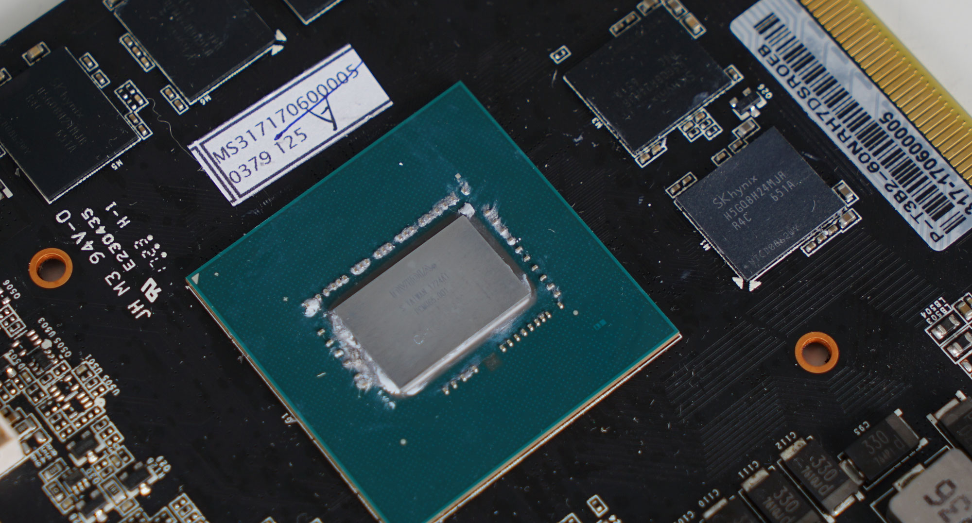 在拆解视频中我们可以看到这款SNPR外置显卡盒内部GPU芯片,其配备的是N卡GTX 1060 6GB GDDR5的显存,主频为1531-1746MHz,主频超越公版的1060。旁边是海力士的1GB显存颗粒,拥有6个围绕在GPU中央。