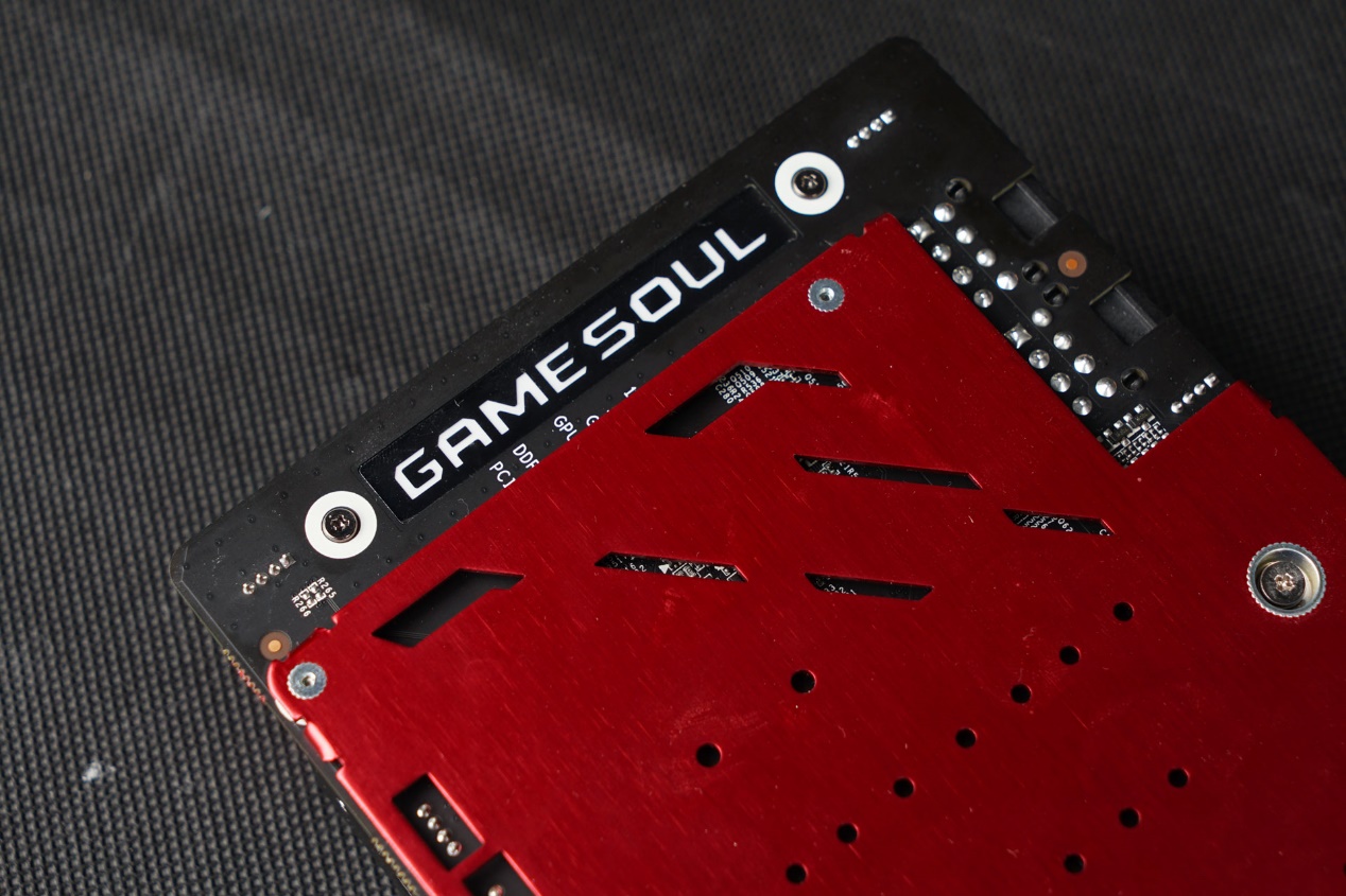 另外顶部的GameSoul也标志了G魂“游戏之魂”的定位,不过外观部分见仁见智,有人觉得G魂相机军舰部似的顶部设计十分不协调,也有人就喜欢这种范,笔者并不好加以评判,但结合电竞风格最主流的红黑配色,相信对电竞游戏情有独钟的玩家面对这块显卡不会有太大的不满。
